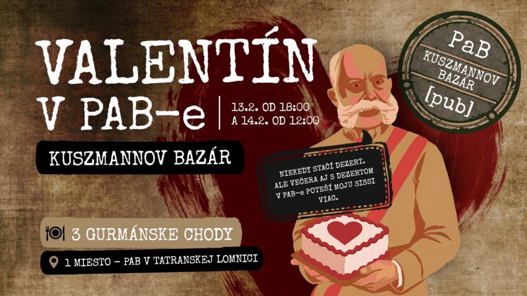 A preto vás pozývame na valentínsku večeru v PaB-e Kuszmannov bazár. Pripravíme pre vás 3 gurmánske chody a okrem nich sa môžete tešiť na príjemnú spoločnosť nášho Franza Jozefa I. (pssst ale Franz ešte stále čaká na svoju Sissi aj s dezertom). 😅 Tak čo, pridáte sa k nemu?